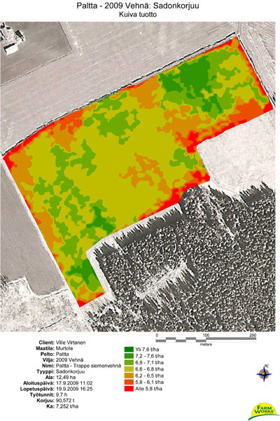 Alla vuodelta 2009 yhden kasvulohkon satokartta.
